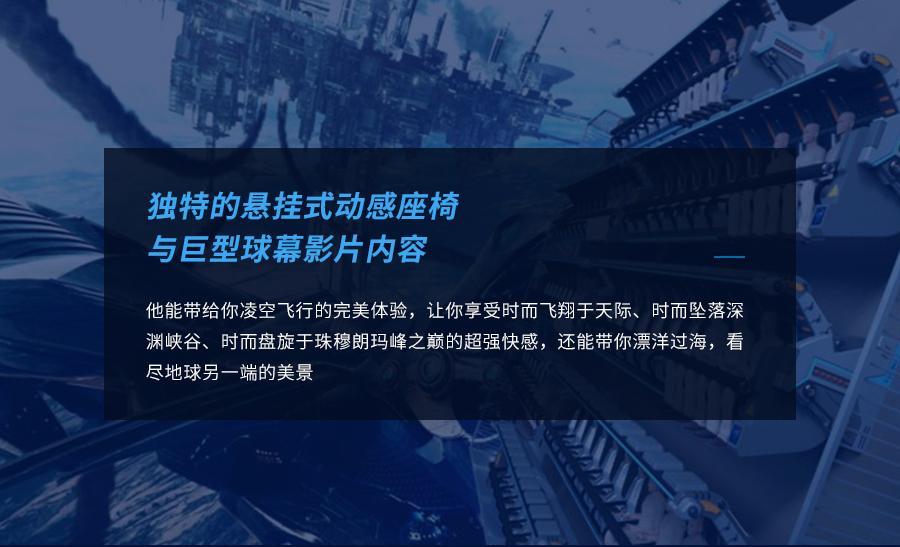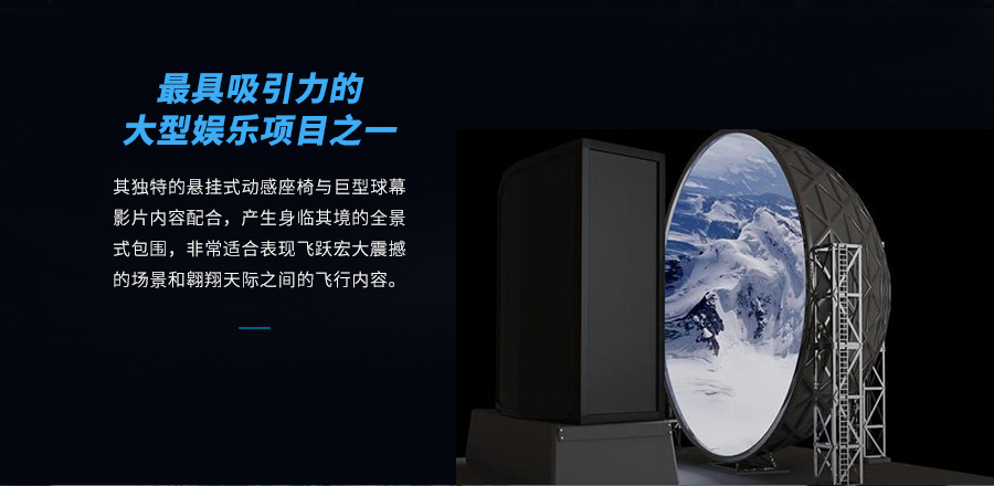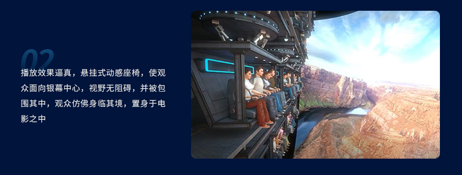 飛行影院,是當(dāng)今主題樂園中最具吸引力的大型娛樂項(xiàng)目之一;其獨(dú)特的懸掛式動(dòng)感座椅與巨型球幕影片內(nèi)容配合,產(chǎn)生身臨其境的全景式包圍,非常適合表現(xiàn)飛躍宏大震撼的場景和翱翔天際之間的飛行內(nèi)容。過程中那急速下降的失重感,快速穿梭在峽谷深淵中的刺激感,能讓游客體驗(yàn)無以倫比的凌空飛行感受。