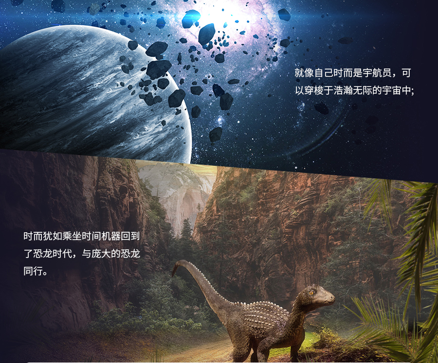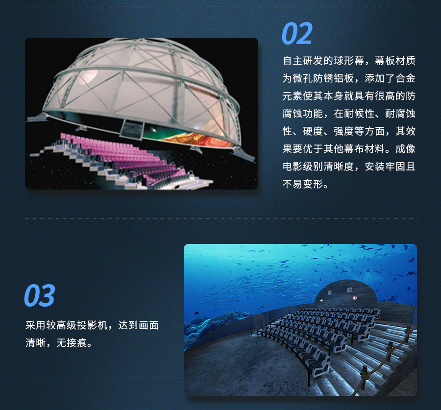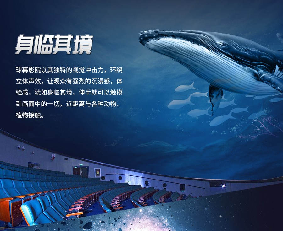 球幕影院以其獨(dú)特的視覺沖擊力,環(huán)繞立體聲效,讓觀眾有強(qiáng)烈的沉浸感,體驗(yàn)感,猶如身臨其境,伸手就可以觸摸到畫面中的一切,近距離與各種動(dòng)物、植物接觸。就像自己時(shí)而是宇航員,可以穿梭于浩瀚無(wú)際的宇宙中;時(shí)而猶如乘坐時(shí)間機(jī)器回到了恐龍時(shí)代,與龐大的恐龍同行。