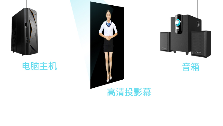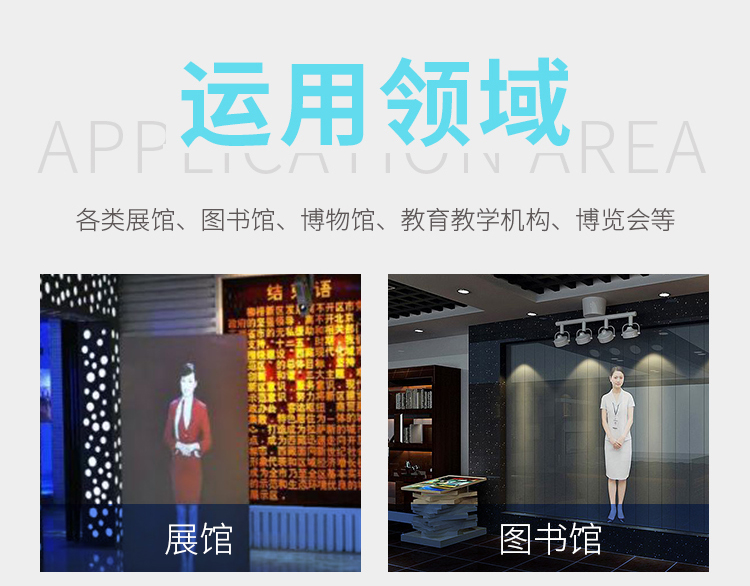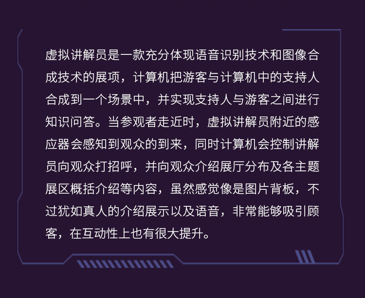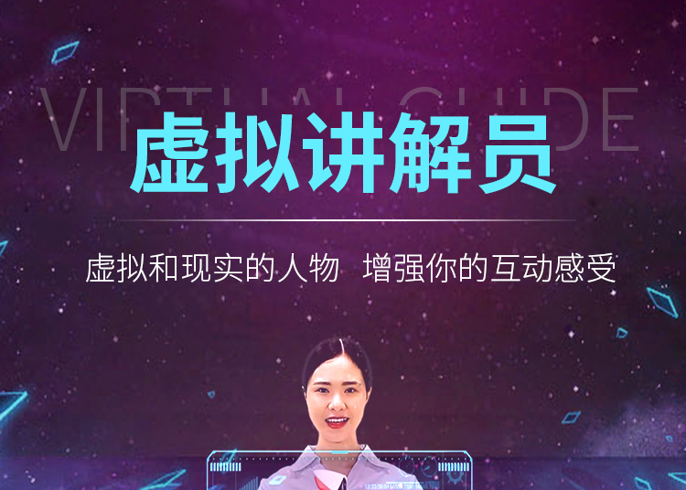虛擬講解員,也稱作虛擬迎賓員,是一種觸發(fā)式模擬圖像投影系統(tǒng)。一般安裝在展廳的大門處,當賓客走近時,會觸發(fā)感應(yīng)系統(tǒng),投影儀立刻將圖像投射到玻璃上,呈現(xiàn)出與真人一樣高的虛擬講解員形象,對賓客表示歡迎,并對展廳和展項作簡單的講解。