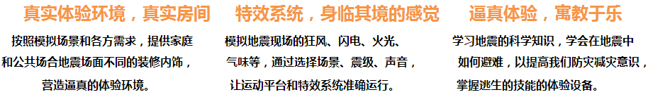 地震館讓用戶能感受到地震的恐怖與殘酷,讓用戶體驗到地震時身處房屋內的真實感覺,還會讓用戶遭遇地震所造成的室內火災。在模擬出來的情節(jié)中,用戶能夠根據(jù)提示,學習在地震中正確的自救方式。最真實地受眾親身體驗地震的感覺,突出體現(xiàn)地震時地面劇烈抖動,波動縱波,橫波,加之視景,音響,特效的有機配合,讓人如臨其境。跟進一步了解地震的相關知識,達到一定的科普效果,提高人們的防震減災意識。