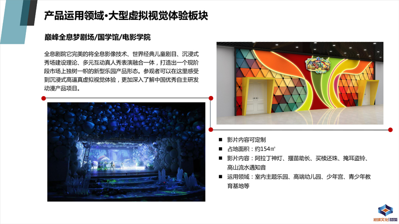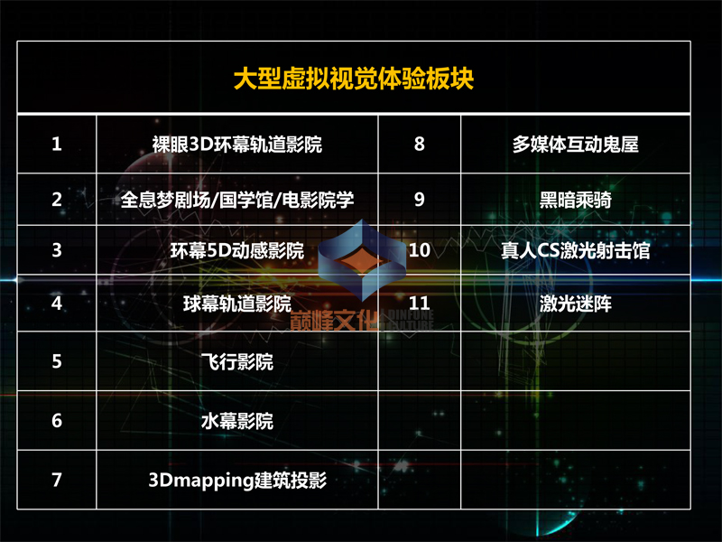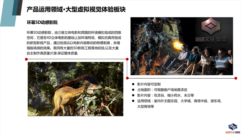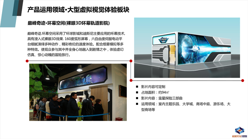巔峰科技特種影院項(xiàng)目,匯聚數(shù)字媒體產(chǎn)業(yè)的精華,以創(chuàng)新的技術(shù)革命,領(lǐng)導(dǎo)產(chǎn)業(yè)復(fù)興。主要產(chǎn)品有:天幕影院,飛行影院,5D氣動(dòng)劇場、7D互動(dòng)影院,除設(shè)計(jì)和搭建業(yè)務(wù)外,還提供現(xiàn)場的技術(shù)活動(dòng)支持。